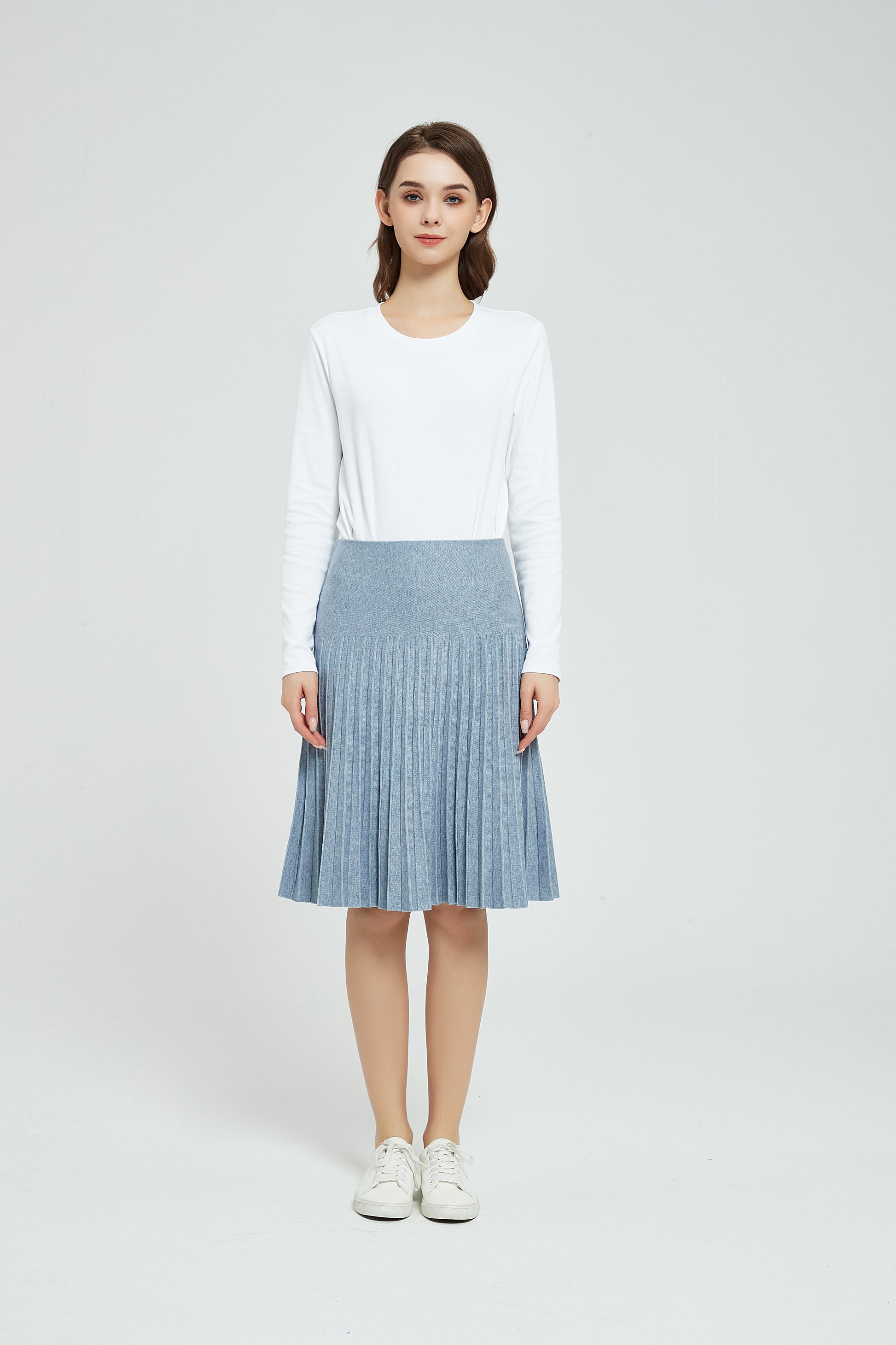 Our pleated skirts are more of an ALINE shape, (rather than the FIT N FLARE year round). It is for this reason that they appear longer (even if measuring the same) because there is no flare.  It is also for this reason that the waist size appears a little bigger (even though our YEAR ROUNDS stretch to the same size).