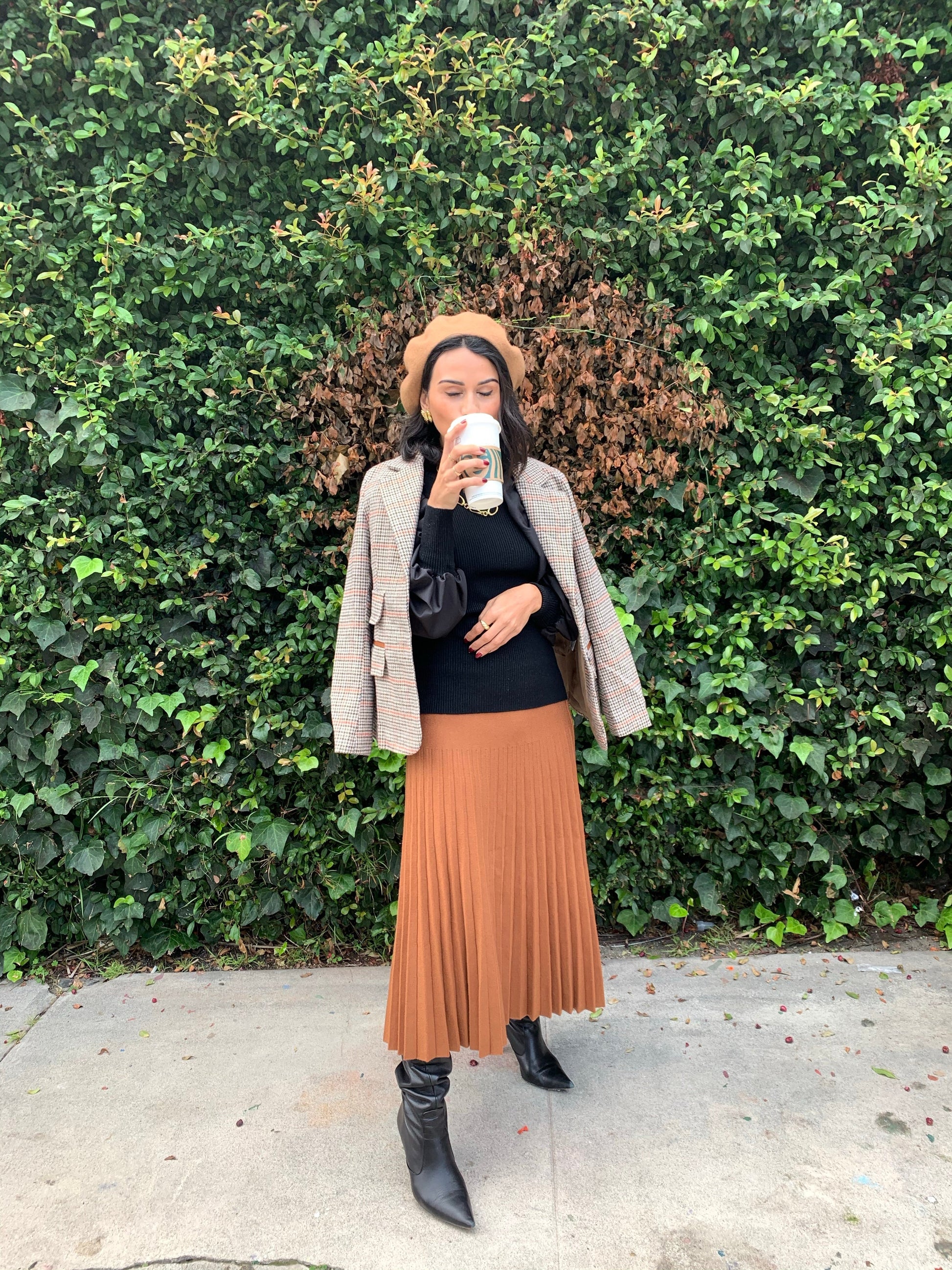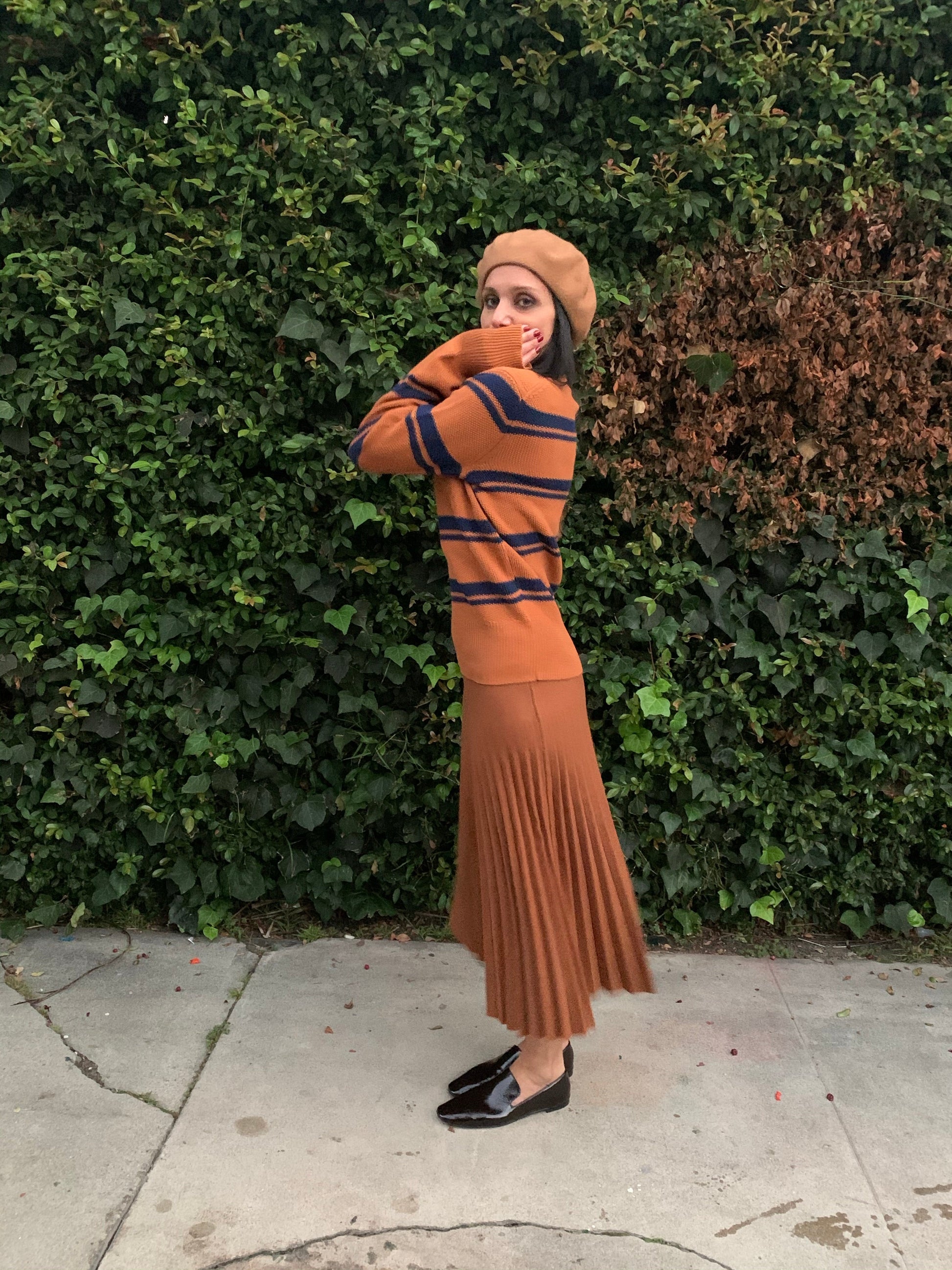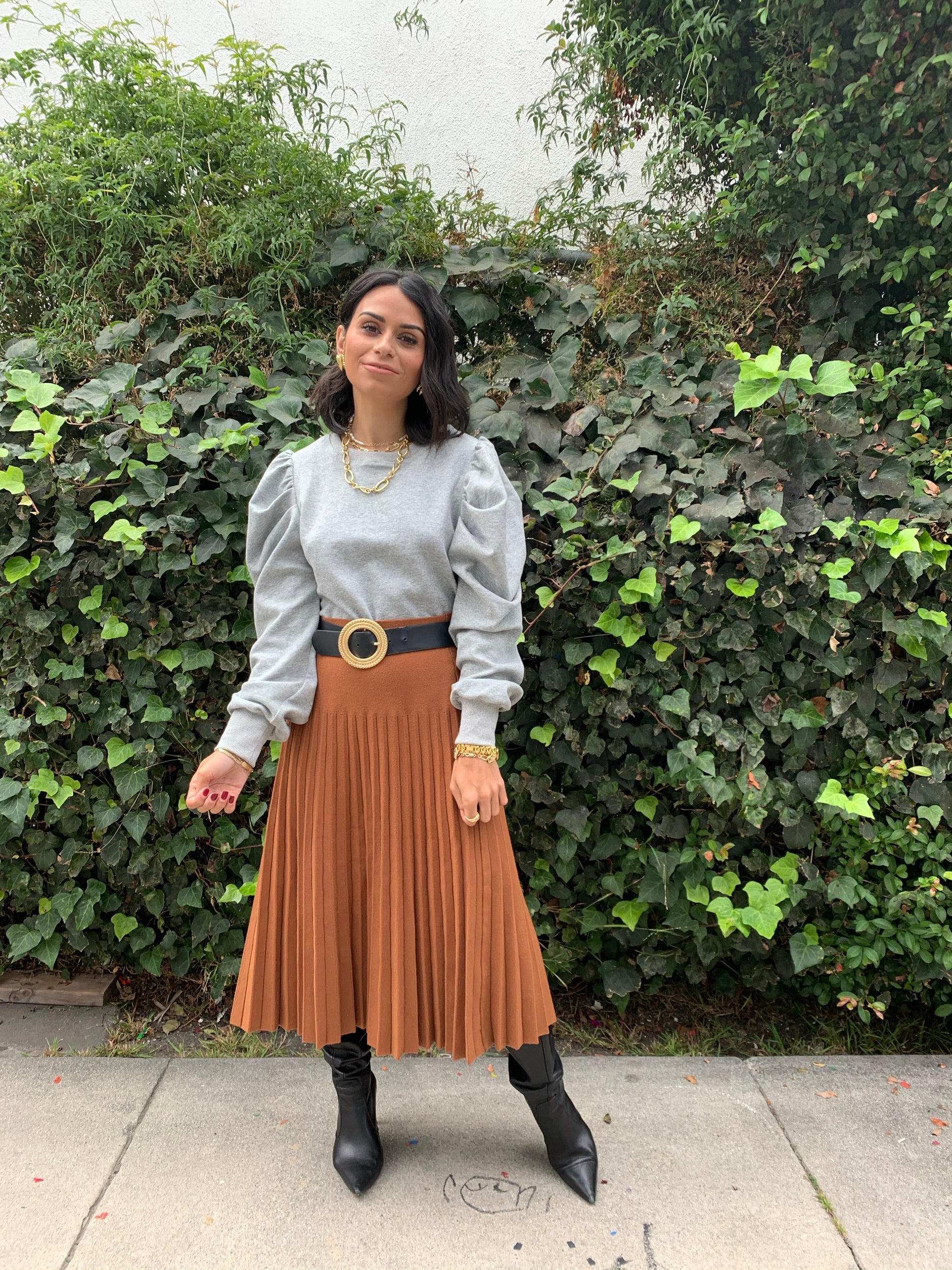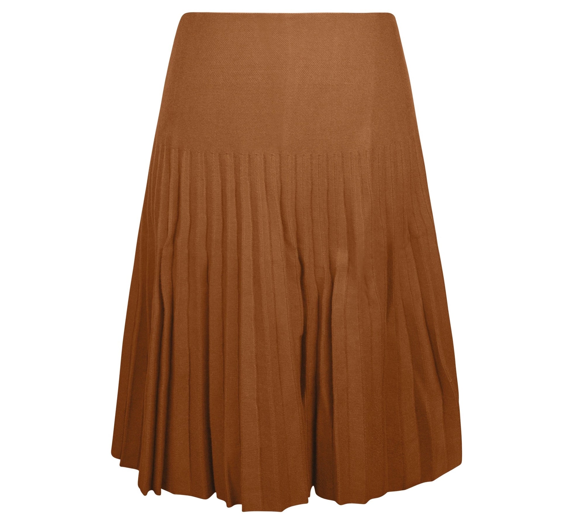 Our pleated skirts are more of an ALINE shape, (rather than the FIT N FLARE year round). It is for this reason that they appear longer (even if measuring the same) because there is no flare.  It is also for this reason that the waist size appears a little bigger (even though our YEAR ROUNDS stretch to the same size).
